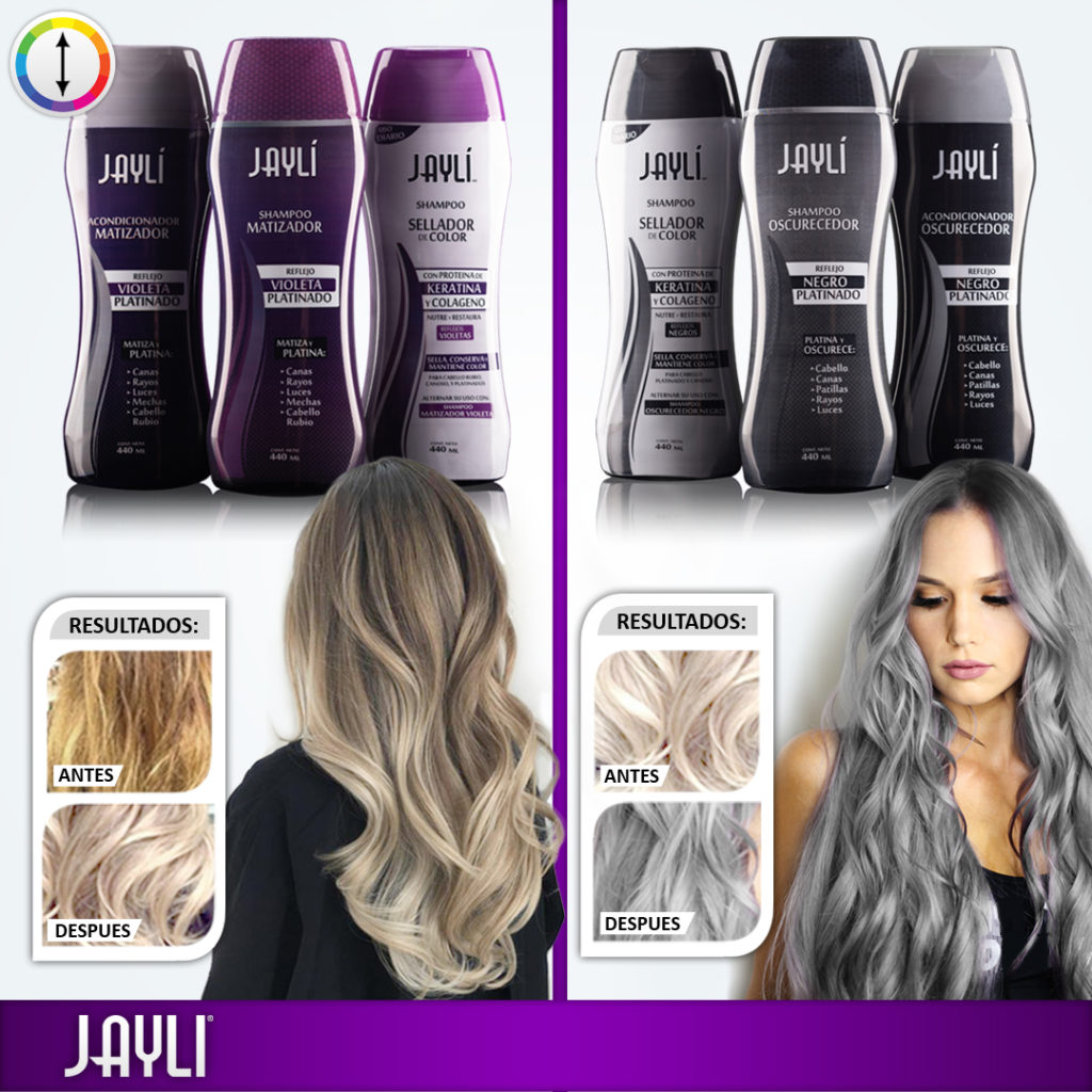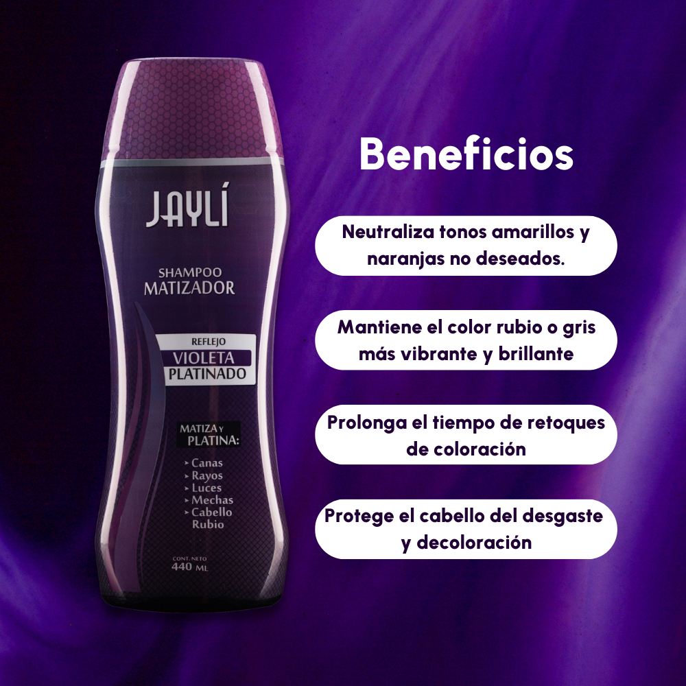 Experimenta la distinción con nuestro Shampoo Violeta Jaylí, diseñado para cabello rubio, rayos, luces, mechas y canas. Su fórmula avanzada matiza, platina y aclara de manera precisa, reduciendo los tonos amarillos o anaranjados para lograr un platinado cenizo impecable. Eleva tu rutina capilar con este producto profesional que ofrece resultados notables. ¡Hazlo tuyo ahora y descubre la transformación que tu cabello merece con Jaylí!